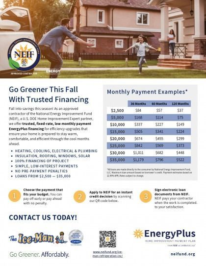 As one of the most trusted heating and cooling systems contractors in the area, The Ice Man is proud to offer comprehensive options that can help finance your new Carrier heating, cooling, or indoor air quality equipment. With our strong relationship with Wells Fargo Bank, N.A., we are confident that all of our customers can choose a financing option that can help them fund their unexpected HVAC needs. Financing is subject to approved credit.
